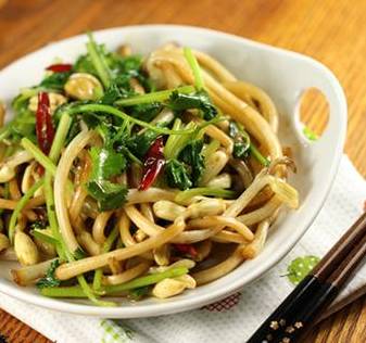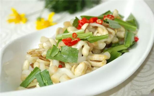 食材:花生芽300克,韭菜150克,食油30克,精盐、味精适量。
