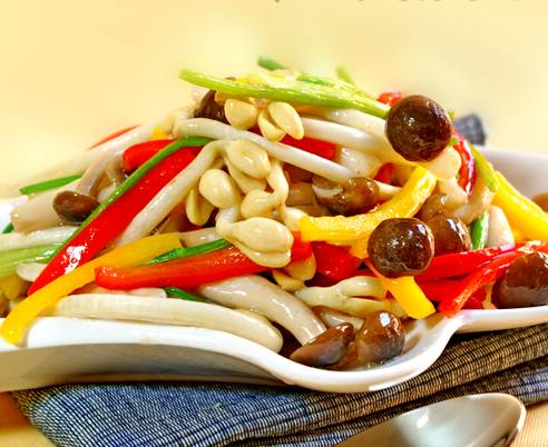 6、另起锅,锅里放少许油,倒入蟹味菇略炒一会儿,放入黄椒、红椒丝、花生芽、芹菜一起炒,火要旺动作要快,这样炒出的菜才具有菜香味,最后略放少许水调味打芡淋少许香油出锅装盘即可。