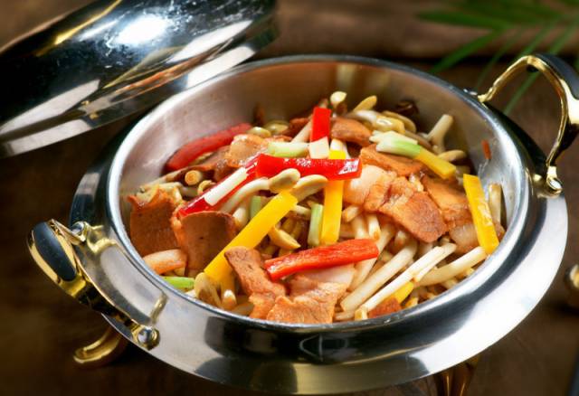 3、锅下猪油烧热,下五花肉、金华火腿煸炒至出香味,放入荆沙豆酱、干辣椒、小米椒,然后依次放入精盐、鸡粉、味精、老抽、蚝油、十三香,待汤汁梢干后起锅即可。