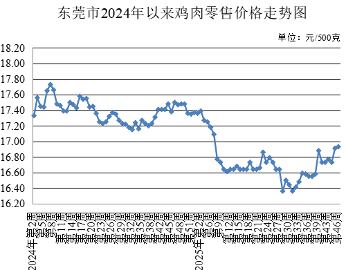 第46周,监测的牛肉农贸市场零售均价为每500克48.02元,较上周上升0.21%。牛腩农贸市场零售均价为每500克43.45元,较上周下降0.07%。鸡肉农贸市场零售均价为每500克16.93元,较上周上升0.12%。
