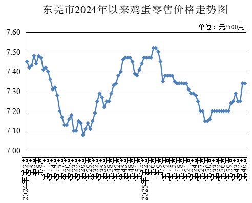 第46周,监测的鸡蛋农贸市场零售均价为每500克7.34元,与上周持平。