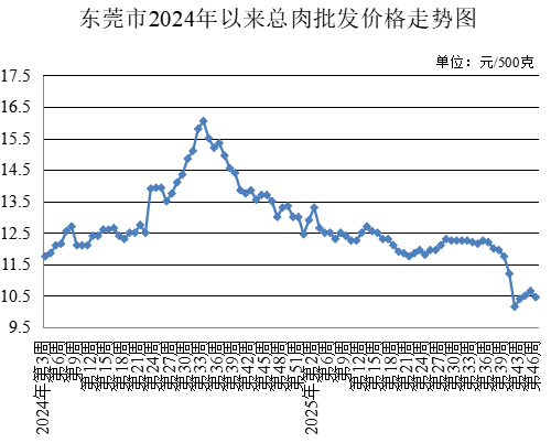 第46周,生猪出场价格为每公斤12.60元,较上周下降4.55%。总肉批发均价为每500克10.45元,较上周下降1.88%。