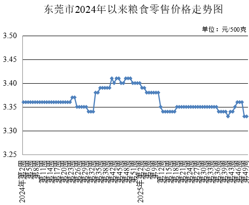 第49周,监测的4种粮食农贸市场零售均价为每500克3.33元,与上周持平。其中,3种大米农贸市场零售均价为每500克3.32元,较上周上升0.30%;面粉农贸市场零售均价为每500克3.36元,较上周下降1.18%。5L桶装食用油农贸市场零售均价为每桶95.72元,较上周上升0.16%。