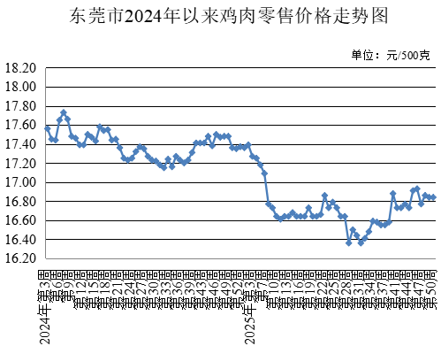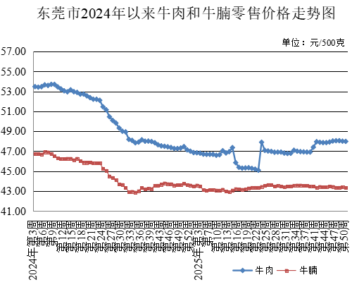 第50周,监测的牛肉农贸市场零售均价为每500克47.98元,较上周下降0.04%。牛腩农贸市场零售均价为每500克43.34元,较上周下降0.12%。鸡肉农贸市场零售均价为每500克16.84元,与上周持平。