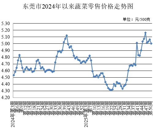 第50周,监测的30种蔬菜农贸市场零售均价为每500克5.00元,较上周下降1.19%。其中,13种叶菜类农贸市场零售均价为每500克5.22元,较上周下降2.61%;17种非叶菜类农贸市场零售均价为每500克4.84元,较上周上升0.21%。