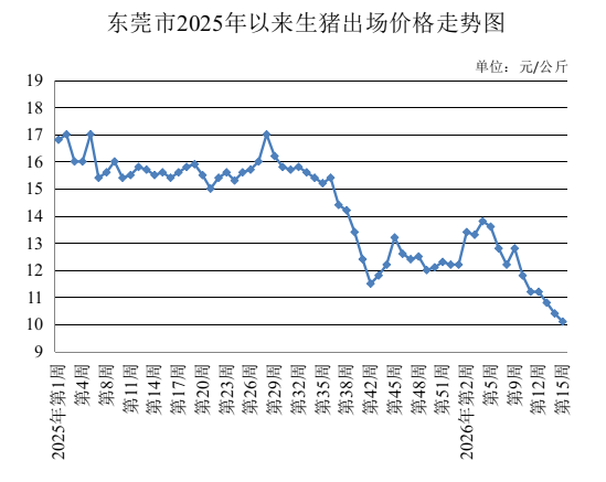 第15周,生猪出场价格为每公斤10.10元,较上周下降2.88%。总肉批发均价为每500克9.60元,较上周下降2.54%。